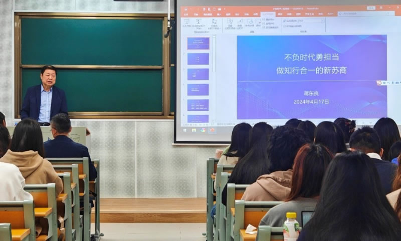 4月17日,宜安控股有限公司董事長、中國民營經濟研究會副會長、江蘇省工商聯副主席蔣東良,應邀來到江南大學東氿校區為同學們講授“習近平經濟思想”這一專題。